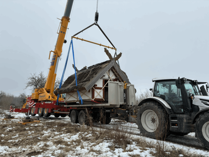 Mit einem Anhänger war die kurze Wegstrecke schnell geschafft und in einem zweiten Hub ging es dann auf das vorbereitete Fundament.
