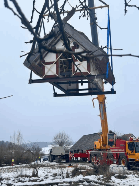 Leider hatte uns das Tauwetter einen Strich durch die Planung gemacht und sp haben wir das Hexenhaus dann etwas „traditoneller“ umgezogen. Leider war unser eigener Teleskostapler einen Ticken zu schwach und wir haben uns etwas Verstärkung organisiert.