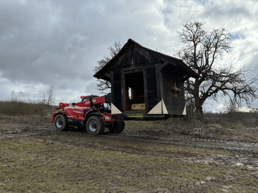 Und nach einem zweiten Hub steht bald die Hütte auf der neuen Parzelle. Nur „noch eben schnell“ die Träger, Verstärkungen entfernen und das sieht doch ganz passabel aus.